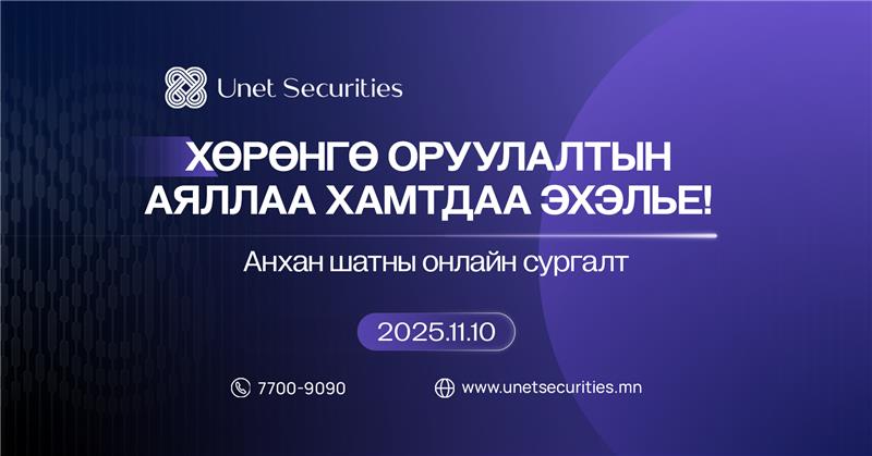 Монголын хөрөнгийн зах зээлийн үнэт цаасны компани болох Үнэт Секьюритис ҮЦК анх удаа хөрөнгө оруулалтад оролцох сонирхолтой иргэдэд зориулсан “Хөрөнгө оруулалтын анхан шатны онлайн сургалт”-ыг 2025 оны 11-р сарын 10-ны өдрөөс эхэлж долоо хоног бүр онлайнаар зоаион байгуулах гэж байна.